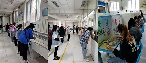 8:30学生及班主任老师如约而至,来到综合楼前广场南北侧集中,开始了我们第一天的就餐演练。同学们保持1米以上间隔,有序排队进入食堂,先洗手、后排队打饭,就坐。一切都井井有序。