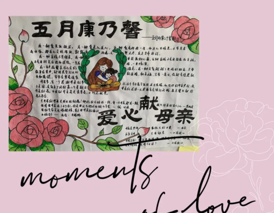 组织各班办一份以“五月康乃馨 爱心献母亲”为主题的手抄报,同学们将自己对母亲的祝福、思念转化为图画和文字,经过精心的排版和制作,最终形成充满感恩之情的爱心作品,献给自己的母亲。