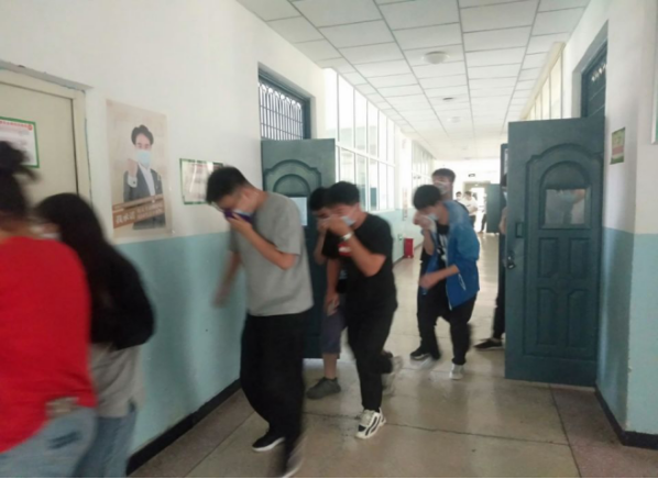 15点40分,尖锐而又急促的火情警报声响起,听到报警声后辅导员、值班老师、班主任立刻做出应急反应,迅速组织各楼层同学用毛巾、手帕捂住口鼻沿楼梯迅速有序撤离到指定位置,并按间隔1.5米要求站成纵队、清点人数。消防员也快速到达现场进行扑救,并将受伤学生及时救出送往医院进行救治。整个演练用时2分多钟,演练结束后,分院党支部书记对此次活动进行了点评和总结,同时对电信诈骗等安全问题也向同学们做了提醒。