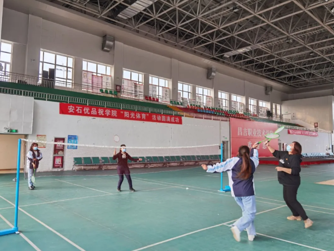 体育馆内,有的老师和学生组队一起打羽毛球,有的老师和学生共同打篮球。在蒙眼取物中,老师和自己结对子学生按照指令配合找到相应的物品。这些游戏,既有师生之间默契配合完成的,也有老师之间的友谊较量,体育馆内笑声不断,师生共同渡过了愉快而轻松的时光。