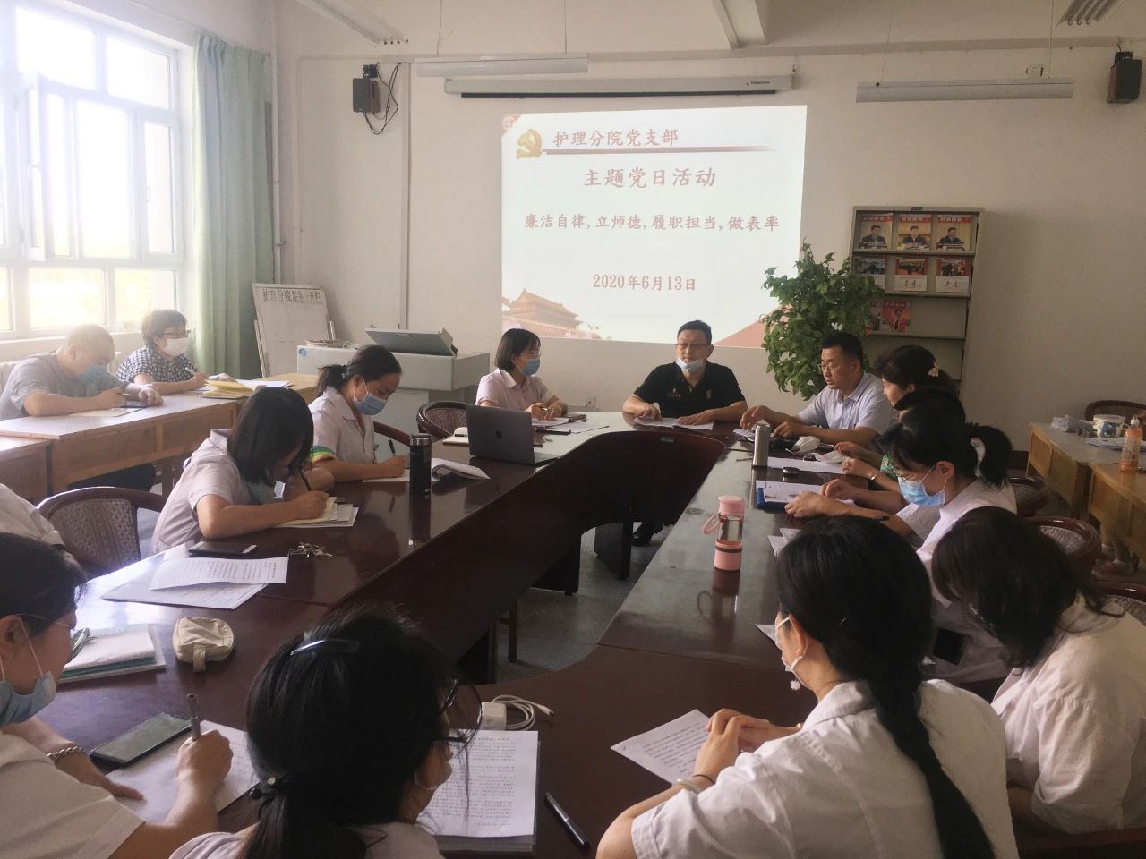 6月13日,护理分院党支部开展了“廉洁自律,立师德,履职担当,做表率”主题党日活动。学院党委委员、副院长田立疆同志以普通党员身份参加了此次活动。